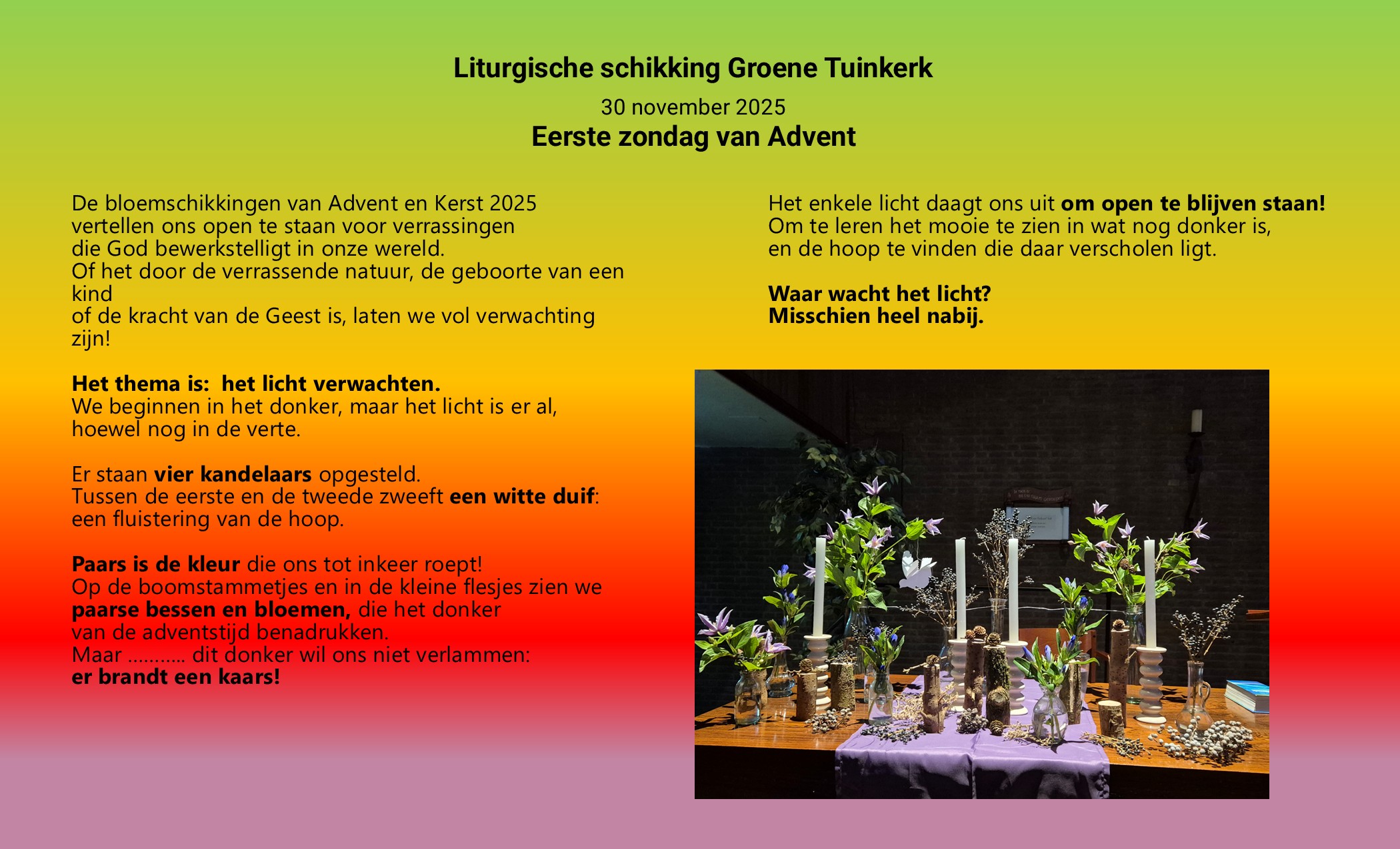 Liturgie, 30 november. Lied van de week, 30 november Liturgische schikking, eerste Advent Uitleg liturgische schikking, eerste Advent
