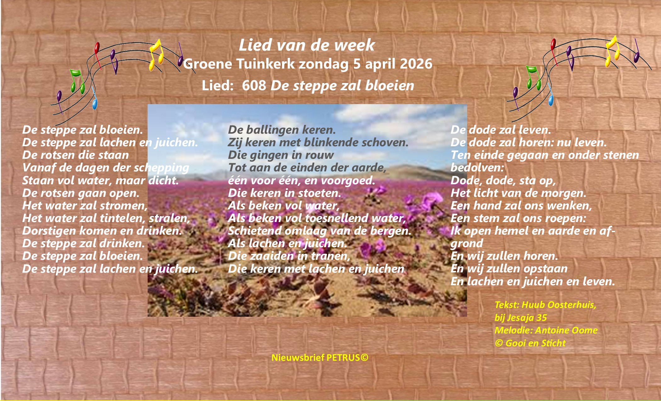 Er is in de Stille Week en op Eerste Paasdag geen dienst in de Groene Tuinkerk. Er is een gezamenlijke dienst in Kerk aan de Maas. Aanvang 19:30 uur. Liturgie Stille Week, Kerk aan de Maas. Vooafgaande aan de Paasdienst op Eerste Paasdag is er een Paasontbijt, aanvang 09:00 uur. De kerkdienst begint om 10:00 uur. Liturgie Eerste Paasdag. Lied van de week, 5 april Video, lied van de week